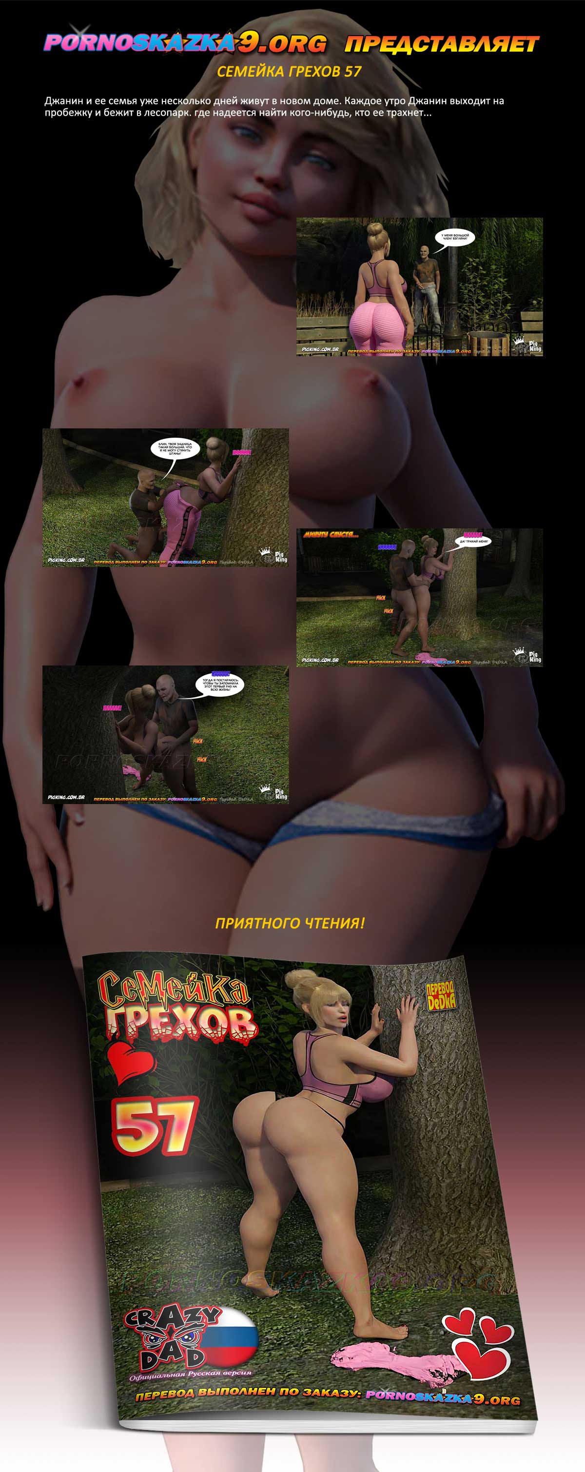 Порно комикс «Семейка грехов. Часть 57». Джанин и ее семья уже несколько дней живут в новом доме. Каждое утро Джанин выходит на пробежку и бежит в лесопарк. где надеется найти кого-нибудь, кто ее трахнет…